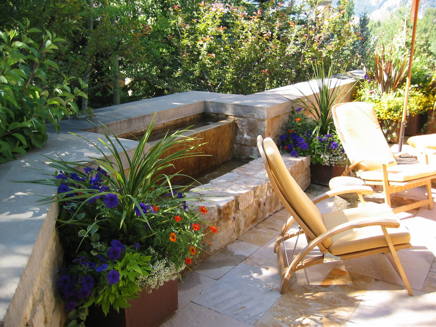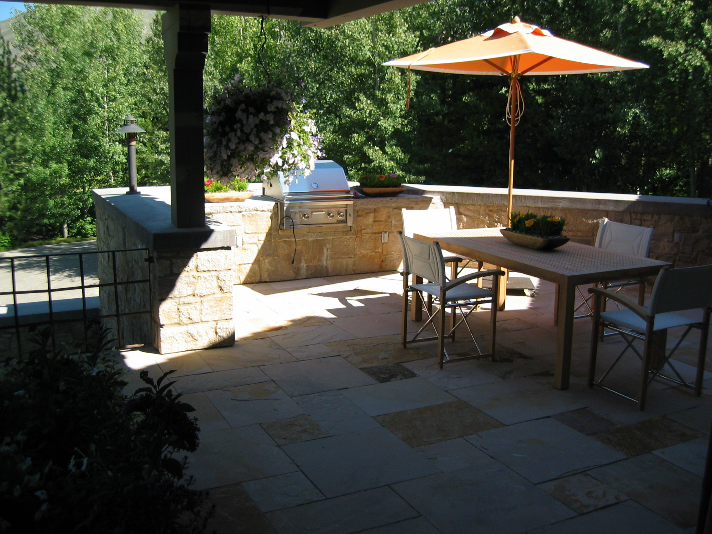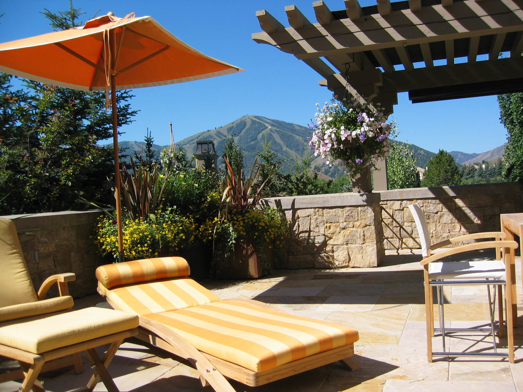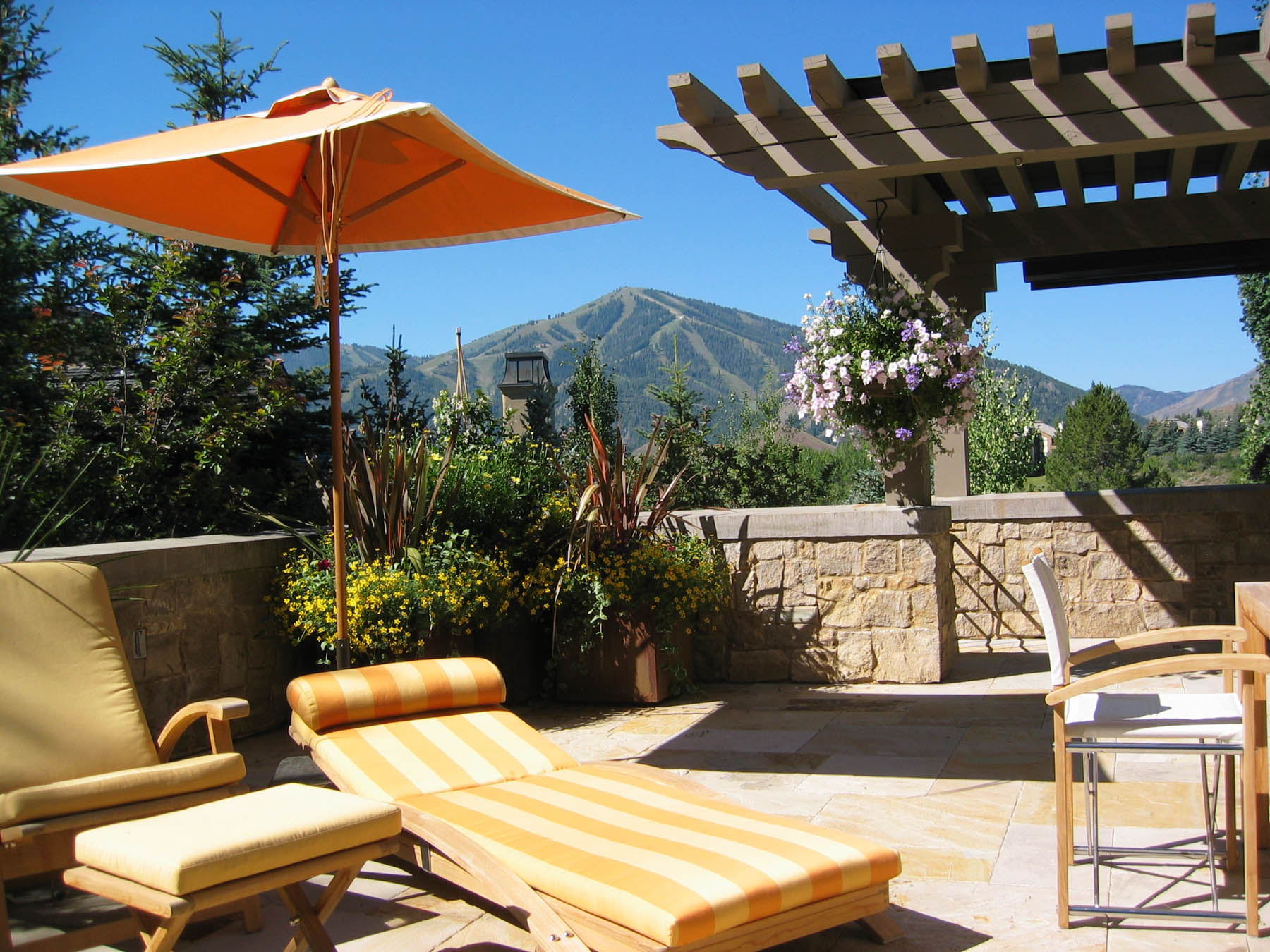 The new owners did not need to make many changes to the interior of this home remodel, but the landscape was not on par with the house and the client’s sophisticated taste. Eggers Associates was called to add interest and intrigue. We started by re-imagining the water feature which the front walkway bridges over. New steel boxes serve as subtle fountains and bring a much more contemporary look. The home has extensive outdoor terraces. We designed a 5 piece flagstone pattern made out of Utah sandstone that could be laid over rooftops as well as on a sand base. The color and texture provide and aesthetically appealing usable surface. Rusted steel planters soften the extensive patios and provide a mountain contemporary aesthetic. Flowerbeds and hanging baskets are the finishing touch to this residence, built to offer the full Sun Valley experience.