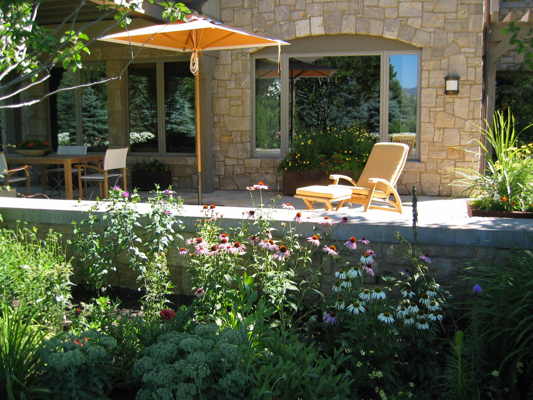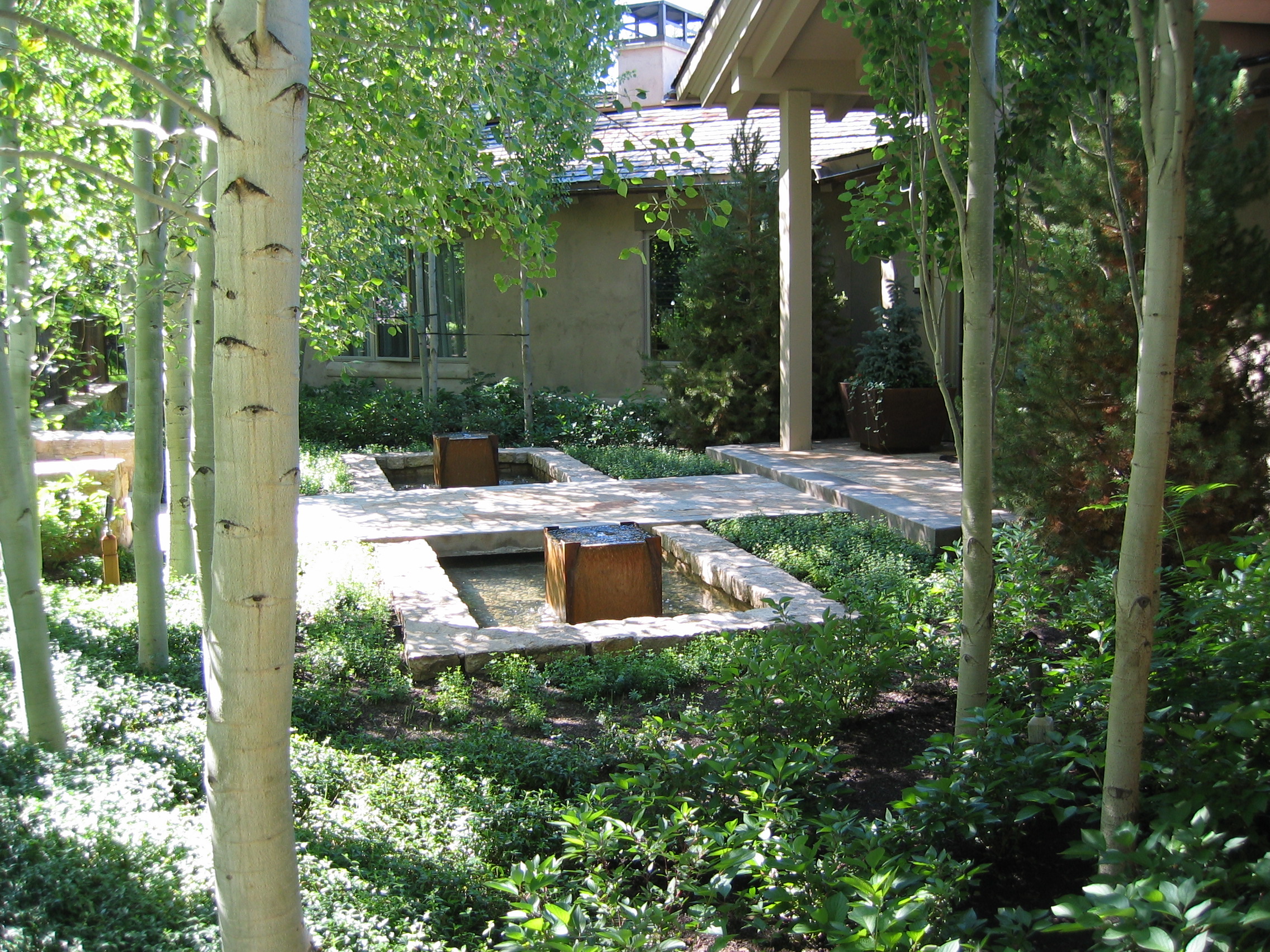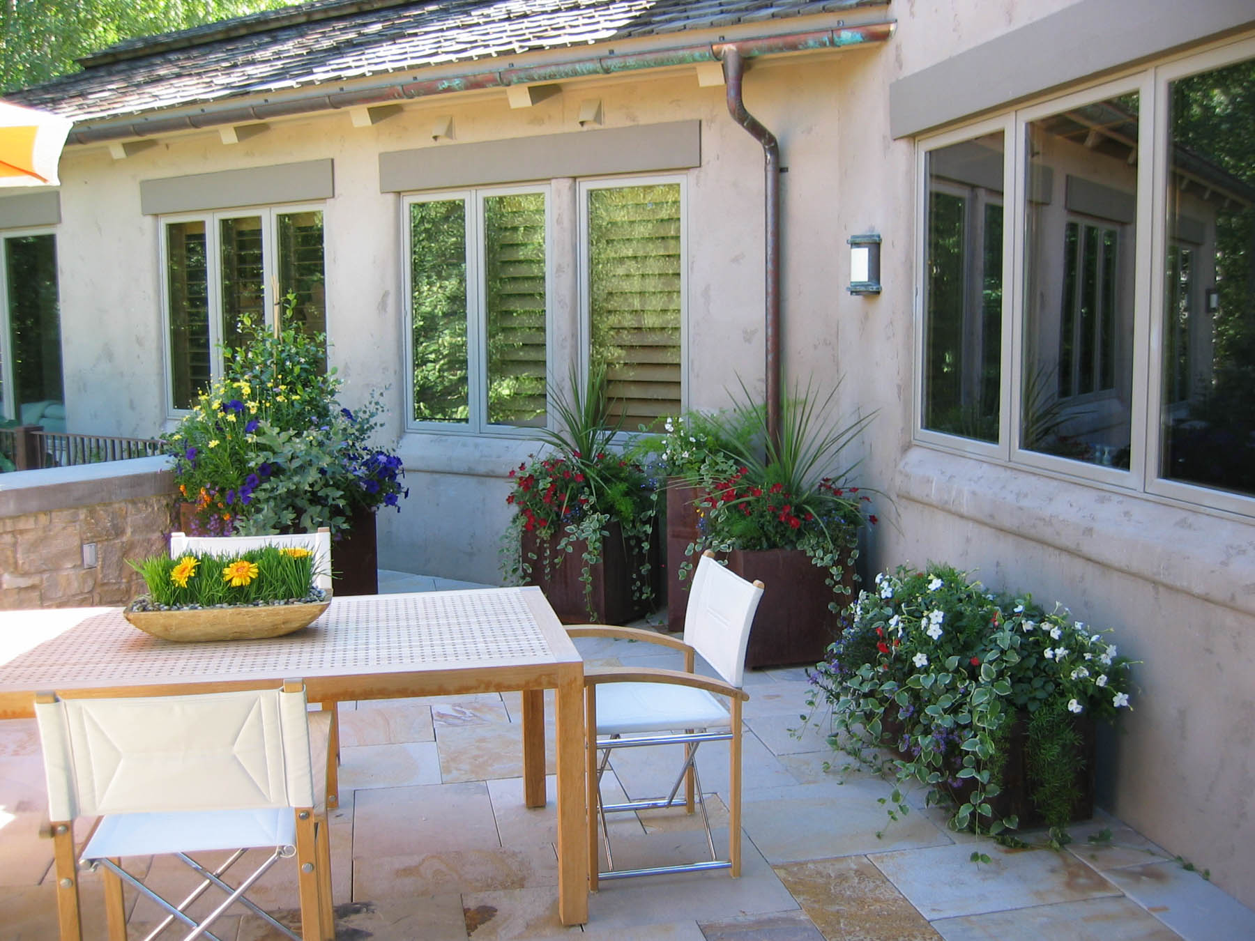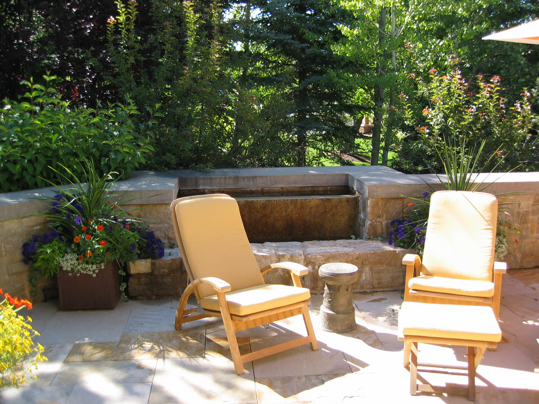 The new owners did not need to make many changes to the interior of this home remodel, but the landscape was not on par with the house and the client’s sophisticated taste. Eggers Associates was called to add interest and intrigue. We started by re-imagining the water feature which the front walkway bridges over. New steel boxes serve as subtle fountains and bring a much more contemporary look. The home has extensive outdoor terraces. We designed a 5 piece flagstone pattern made out of Utah sandstone that could be laid over rooftops as well as on a sand base. The color and texture provide and aesthetically appealing usable surface. Rusted steel planters soften the extensive patios and provide a mountain contemporary aesthetic. Flowerbeds and hanging baskets are the finishing touch to this residence, built to offer the full Sun Valley experience.