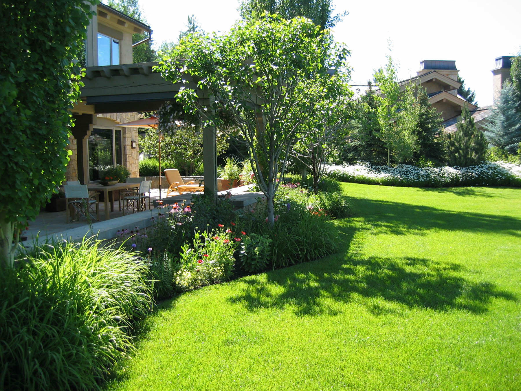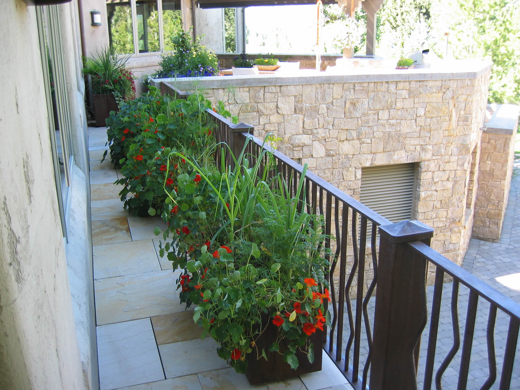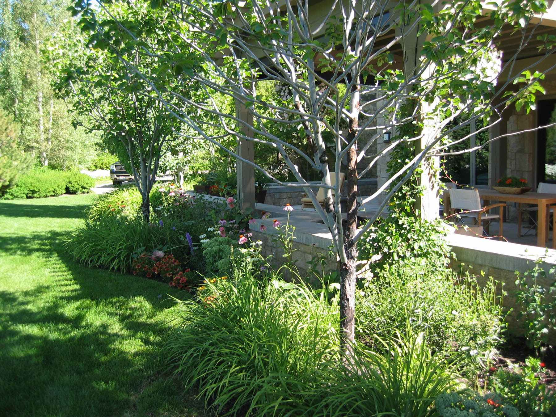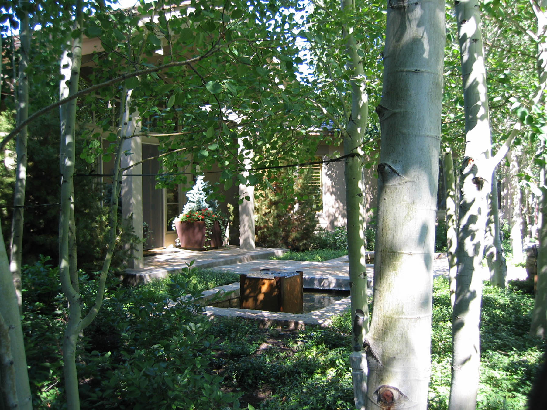 The new owners did not need to make many changes to the interior of this home remodel, but the landscape was not on par with the house and the client’s sophisticated taste. Eggers Associates was called to add interest and intrigue. We started by re-imagining the water feature which the front walkway bridges over. New steel boxes serve as subtle fountains and bring a much more contemporary look. The home has extensive outdoor terraces. We designed a 5 piece flagstone pattern made out of Utah sandstone that could be laid over rooftops as well as on a sand base. The color and texture provide and aesthetically appealing usable surface. Rusted steel planters soften the extensive patios and provide a mountain contemporary aesthetic. Flowerbeds and hanging baskets are the finishing touch to this residence, built to offer the full Sun Valley experience.