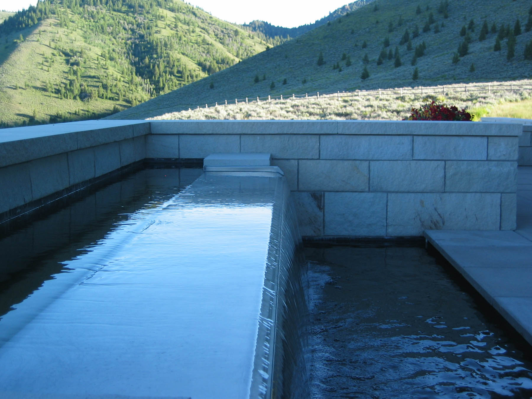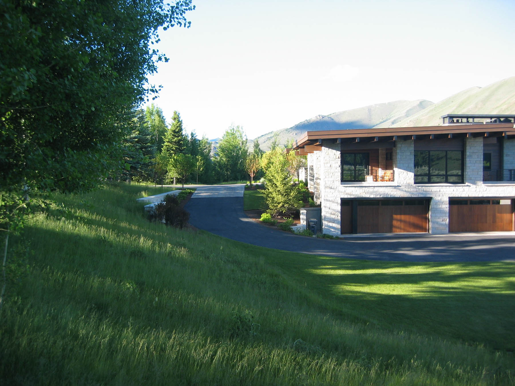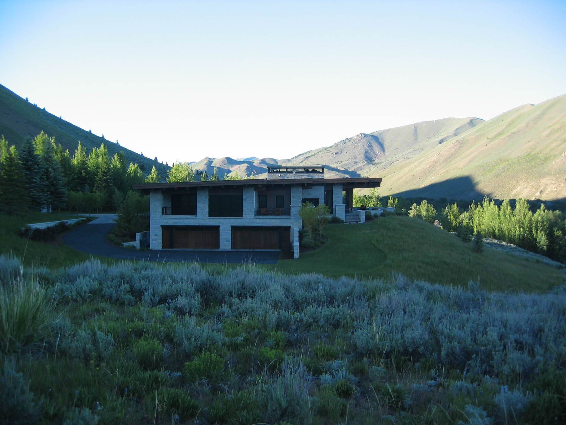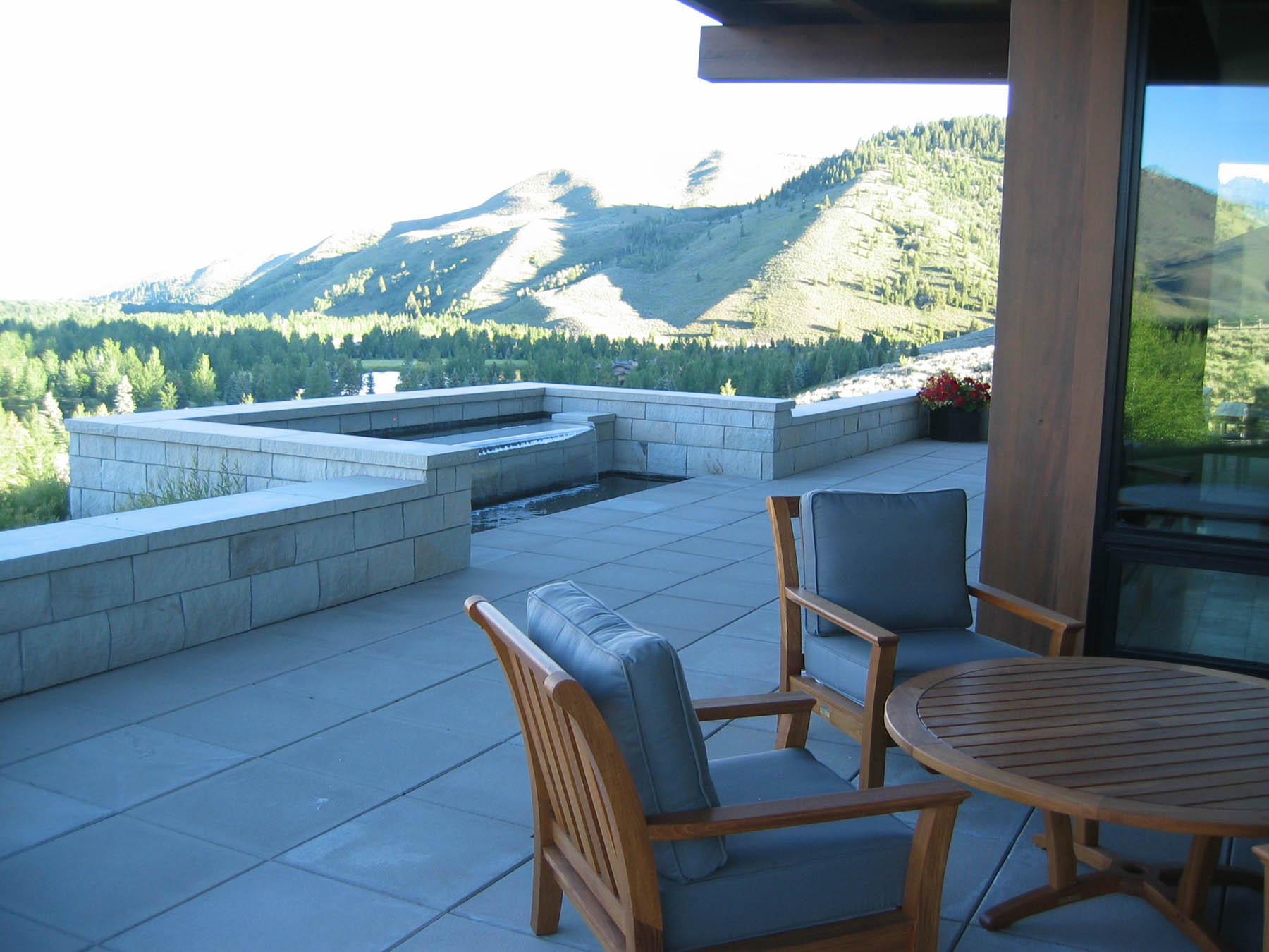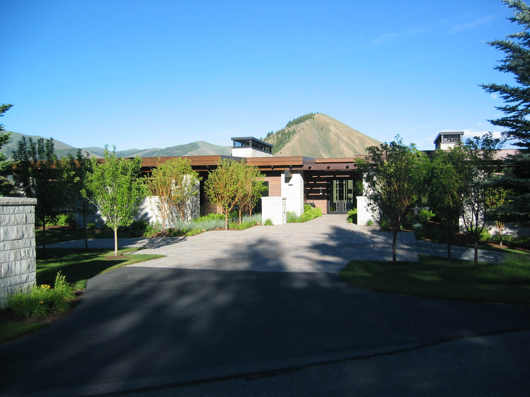 Dramatic views and a contemporary home design grab the attention at this amazing property. An intensive study of the views and sun positions was undertaken to get the house placement perfect. To maximize views the house is elevated and the garage placed underneath. A contemporary custom water feature was designed for the valley facing patio, creating a pleasant pool while eliminating highway noise. The minimalistic, linear approach to the planting design is complimentary to the architecture and maximizes the views. Due to its location close to the forest, “firewise” design was incorporated and tested when the Beaver Creek fire, a large scale forest fire, endangered the property. There is a “water wise” lawn as well, designed for low water use and drip irrigation targets plants with only what water is needed.