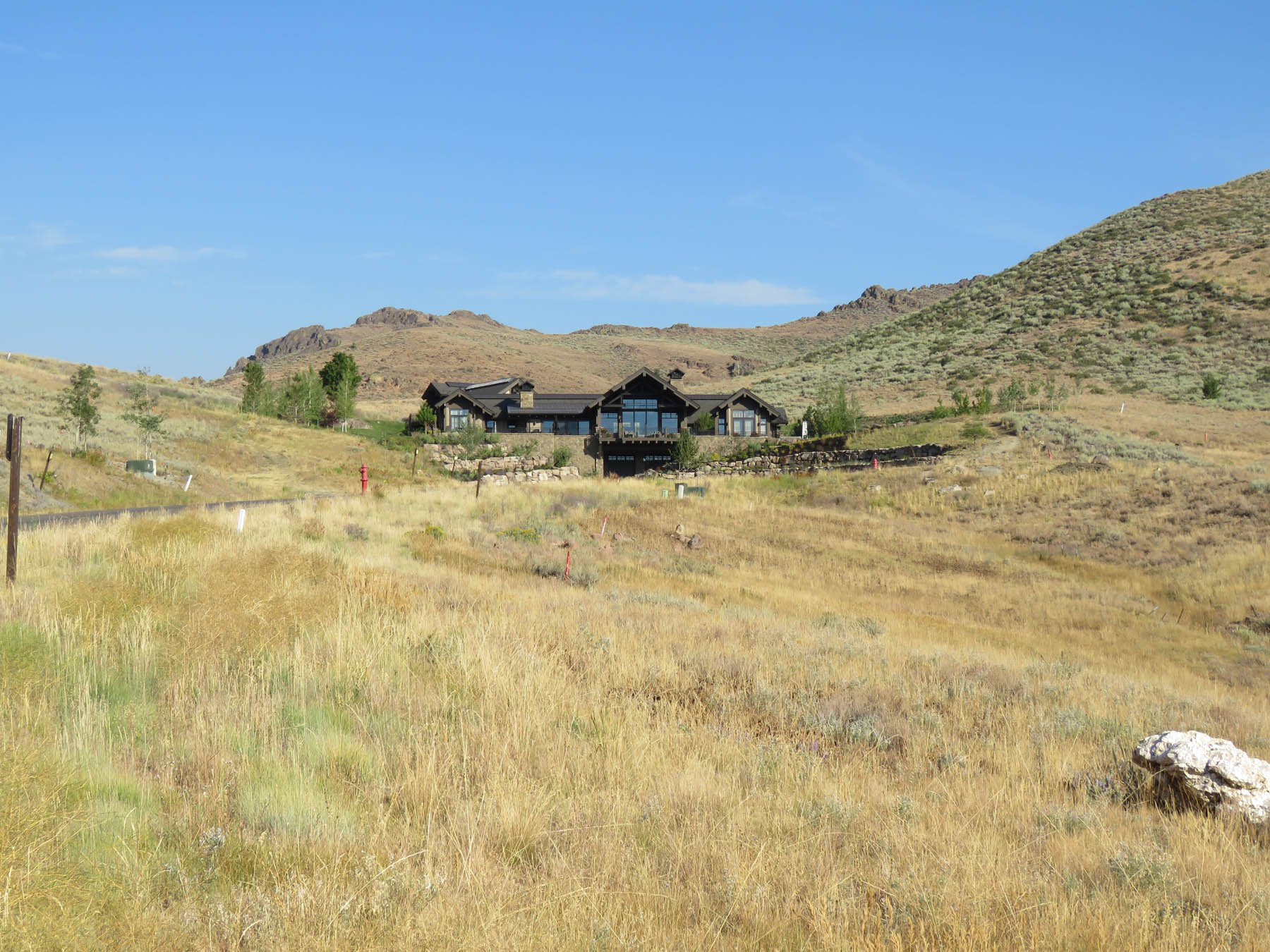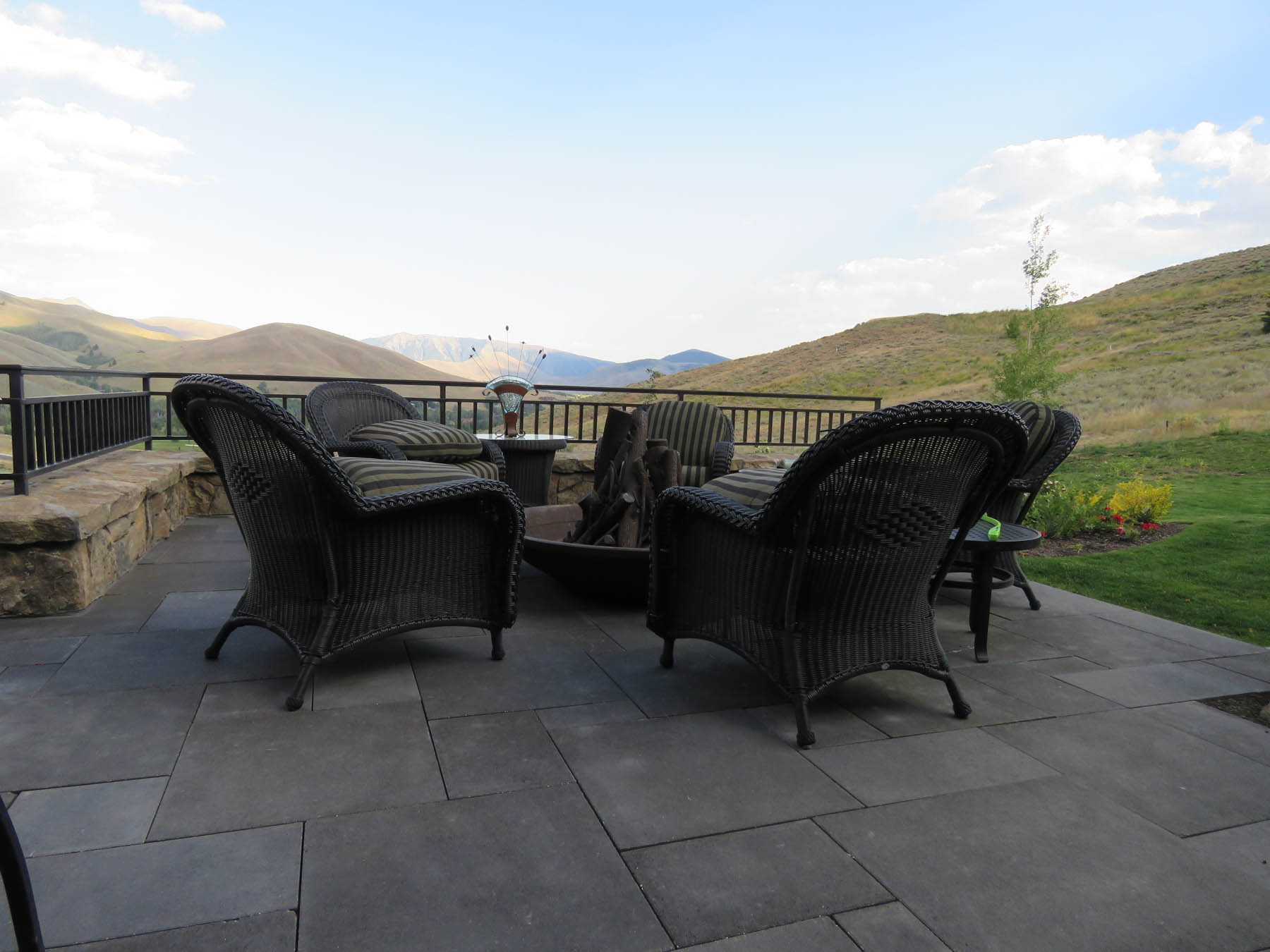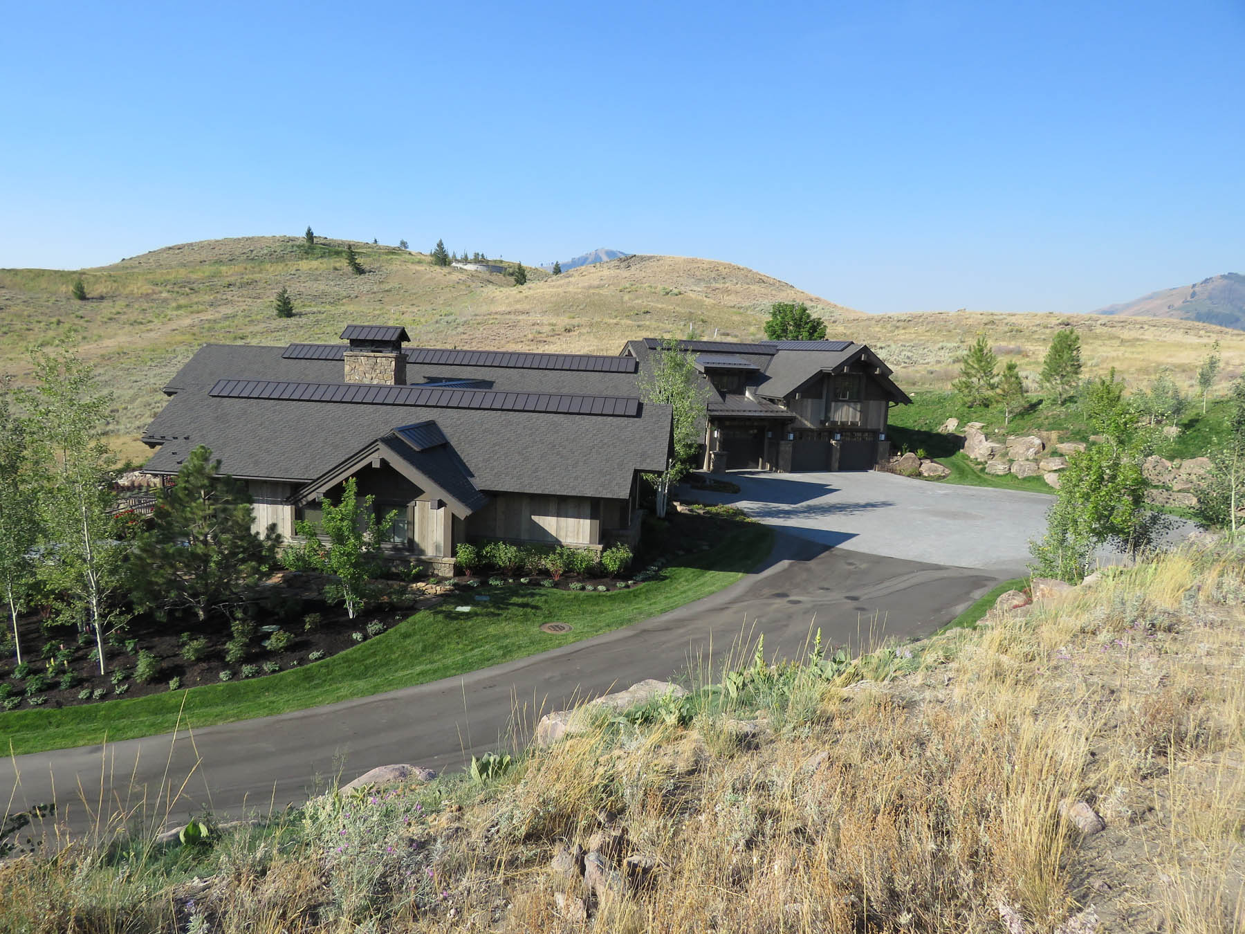 This home had the great challenge of being the first in the newly developed Sun Valley White Clouds. In order to nestle the home into an extremely difficult hillside site, large boulders that match the native landscape were chosen to build retaining walls. In addition, the boulders were placed to mimic natural outcrops and include room for plantings among them. At the end of the day, everything blends seamlessly such that one wouldn’t know the extent of the excavation that had to take place. The site actually played into the owners wish to have additional garages for a car collection by tucking one garage under the house. The careful coordination between architecture and landscape architecture really allows the home to take advantage of sweeping views from property. An extensive outdoor terrace provides a great place to have morning coffee as well as to entertain and relax at the end of another Sun Valley day. A custom designed barbecue area is located off the kitchen with enough space for friends to keep the chef company. A separate patio area has an old steel mining bowl converted to a fire bowl. And a partially sunken hot tub with boulders surrounding provides a relaxing spot to soak. Beautiful large pavers in an ashlar pattern connect all the outdoor spaces together. Landscape lighting subtly highlights the rock walls and patio areas without distracting from the night sky. The care that was taken to design landscaping that fit naturally into the Idaho landscape and would mature to enhance the overall setting sets a high standard for this unique area.