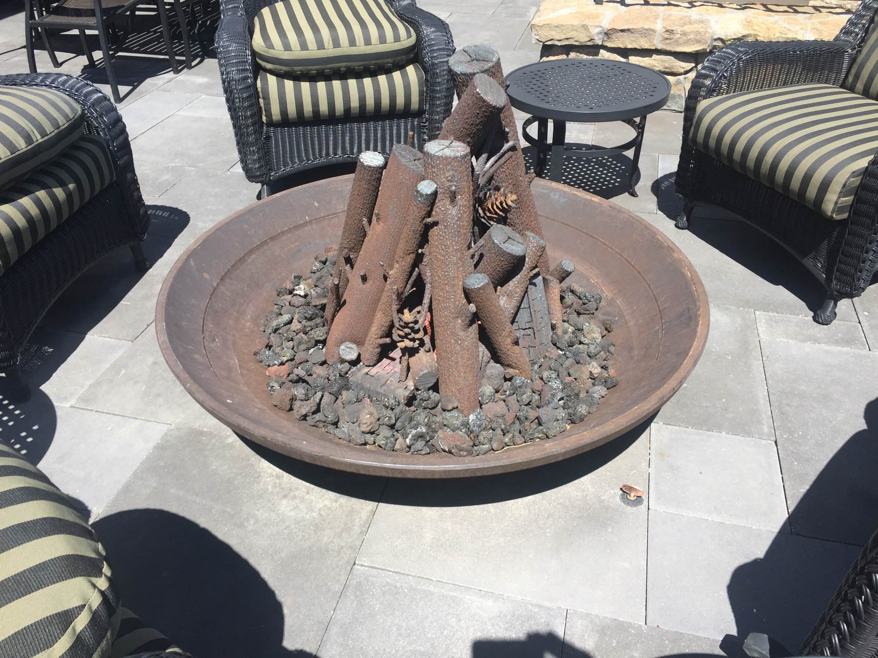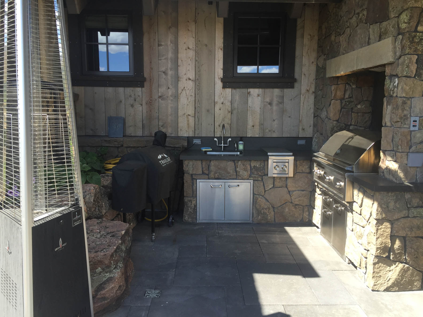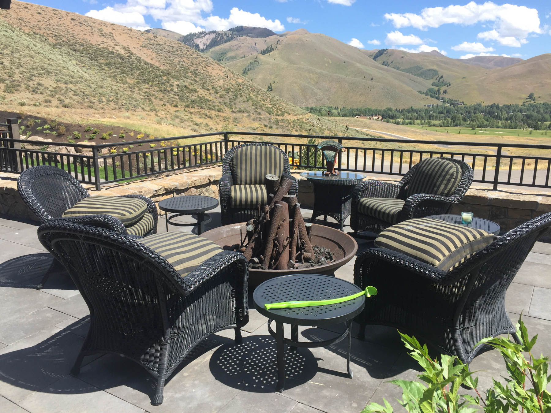 This home had the great challenge of being the first in the newly developed Sun Valley White Clouds. In order to nestle the home into an extremely difficult hillside site, large boulders that match the native landscape were chosen to build retaining walls. In addition, the boulders were placed to mimic natural outcrops and include room for plantings among them. At the end of the day, everything blends seamlessly such that one wouldn’t know the extent of the excavation that had to take place. The site actually played into the owners wish to have additional garages for a car collection by tucking one garage under the house. The careful coordination between architecture and landscape architecture really allows the home to take advantage of sweeping views from property. An extensive outdoor terrace provides a great place to have morning coffee as well as to entertain and relax at the end of another Sun Valley day. A custom designed barbecue area is located off the kitchen with enough space for friends to keep the chef company. A separate patio area has an old steel mining bowl converted to a fire bowl. And a partially sunken hot tub with boulders surrounding provides a relaxing spot to soak. Beautiful large pavers in an ashlar pattern connect all the outdoor spaces together. Landscape lighting subtly highlights the rock walls and patio areas without distracting from the night sky. The care that was taken to design landscaping that fit naturally into the Idaho landscape and would mature to enhance the overall setting sets a high standard for this unique area.