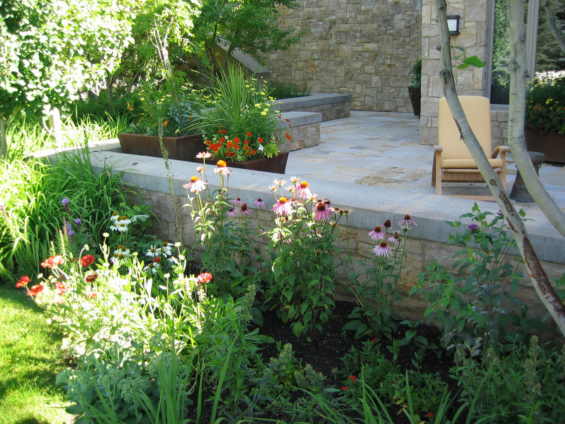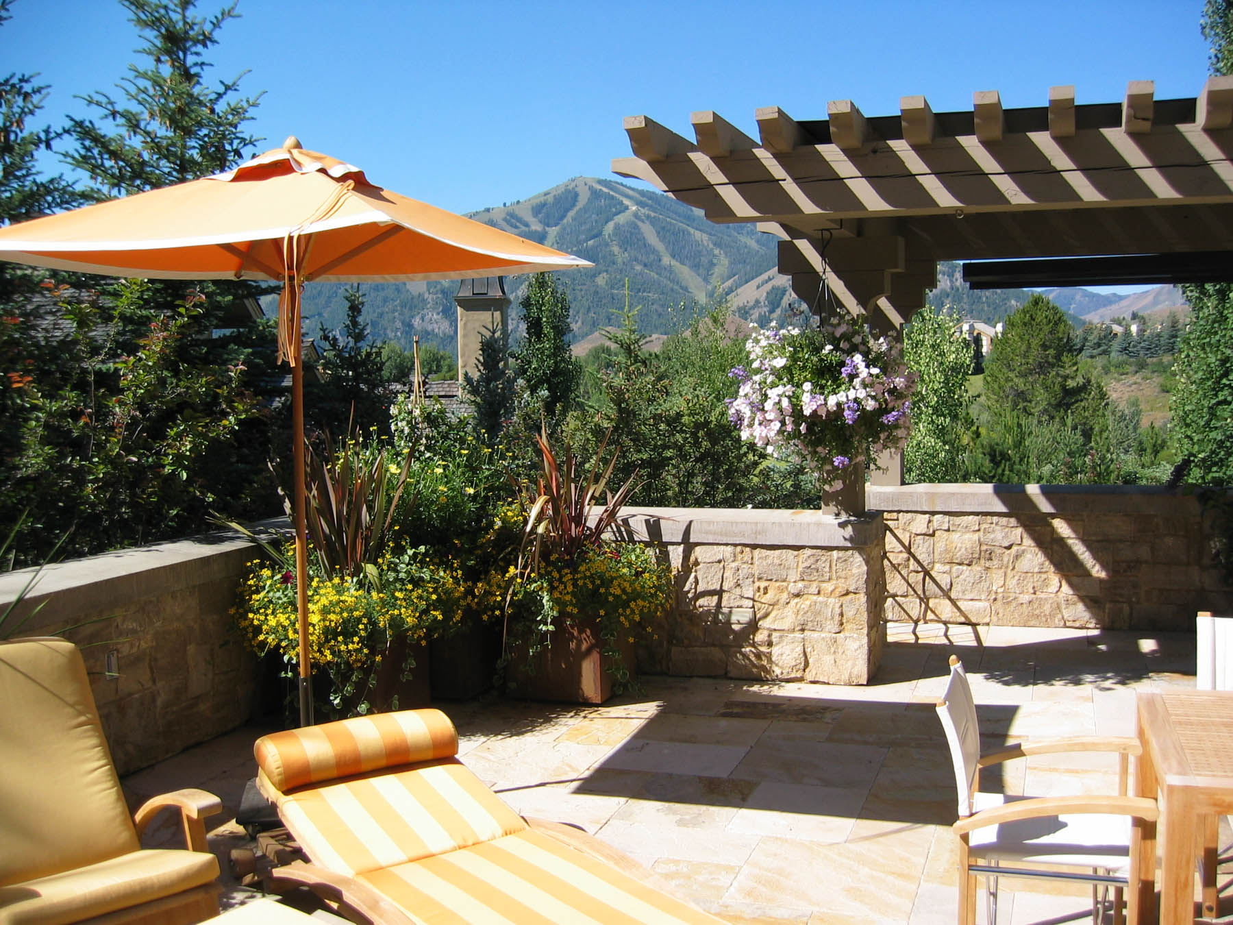 The new owners did not need to make many changes to the interior of this home remodel, but the landscape was not on par with the house and the client’s sophisticated taste. Eggers Associates was called to add interest and intrigue. We started by re-imagining the water feature which the front walkway bridges over. New steel boxes serve as subtle fountains and bring a much more contemporary look. The home has extensive outdoor terraces. We designed a 5 piece flagstone pattern made out of Utah sandstone that could be laid over rooftops as well as on a sand base. The color and texture provide and aesthetically appealing usable surface. Rusted steel planters soften the extensive patios and provide a mountain contemporary aesthetic. Flowerbeds and hanging baskets are the finishing touch to this residence, built to offer the full Sun Valley experience.