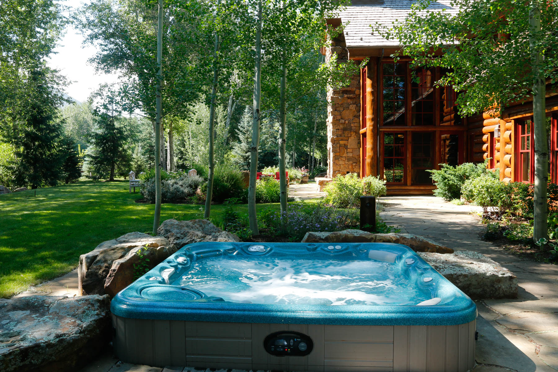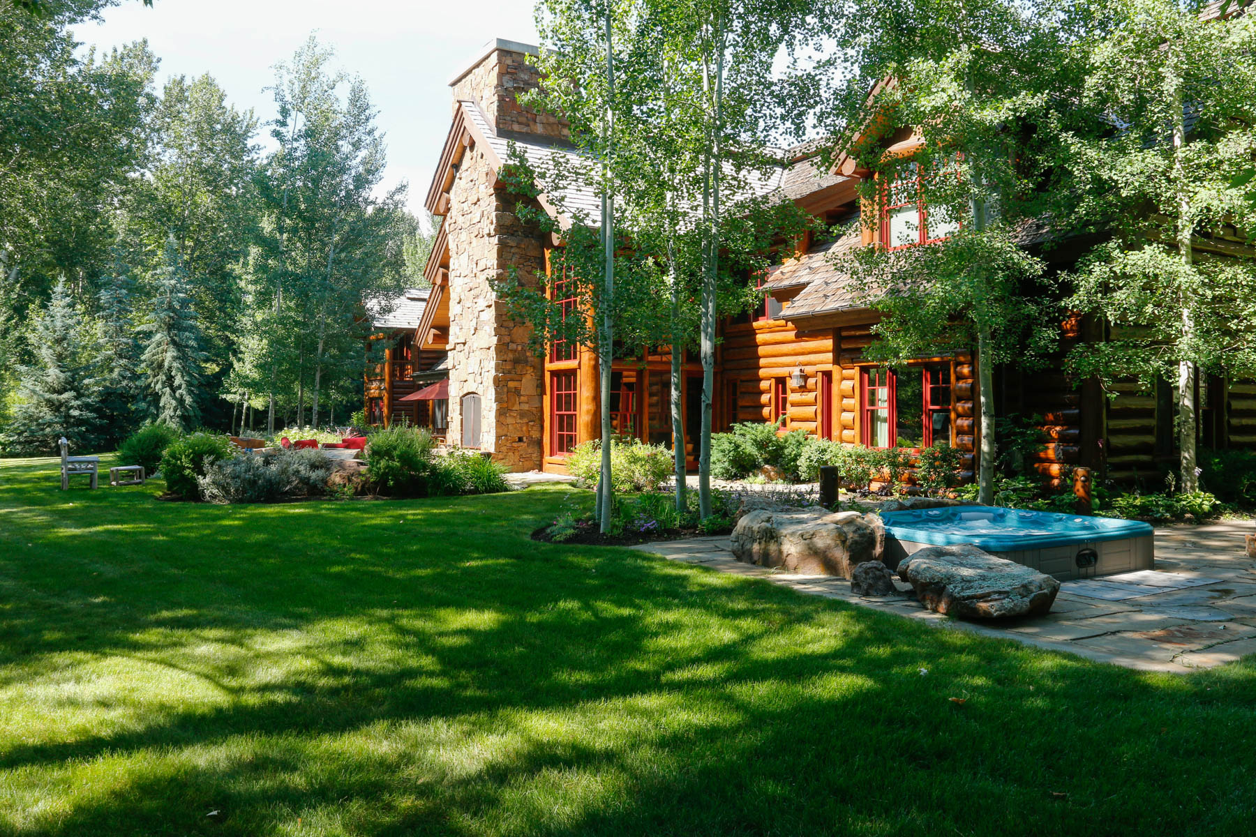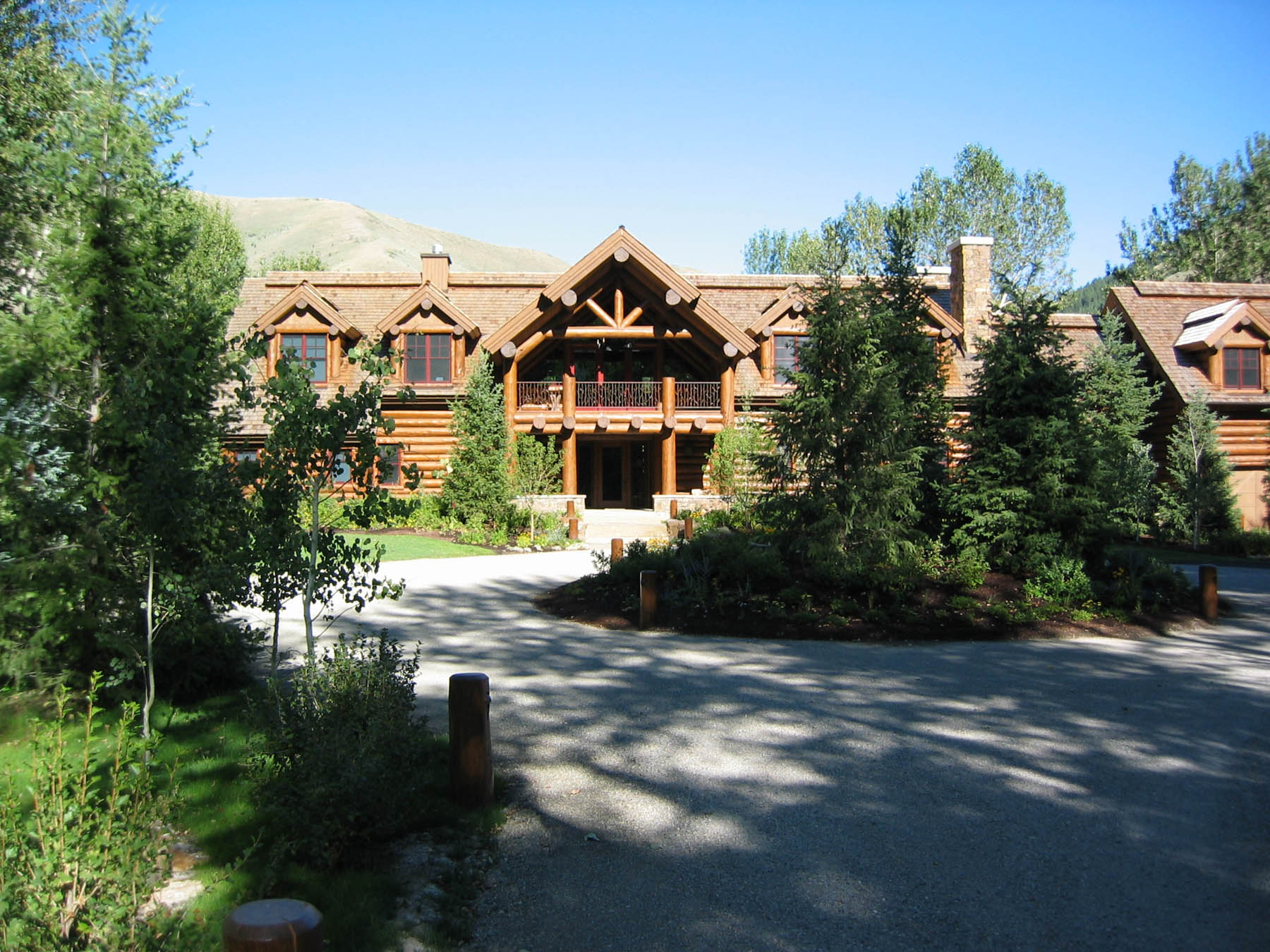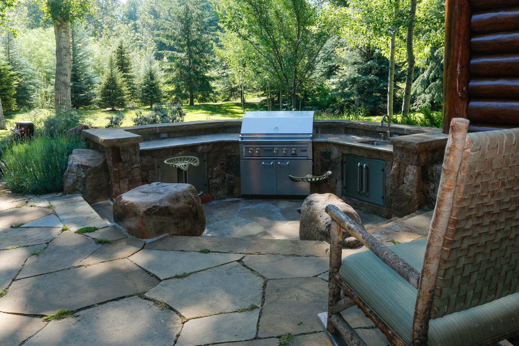 This riverfront property required special consideration to meet regulations for flood plain, wetlands, and riparian areas. The home needed to be elevated and so one of our big tasks was to make a smooth and pleasurable transitions to the house. With this in mind, large boulders and stone slab step were added to access the front elevation of the home, while a flagstone walkout patio at the rear of the home meets the elevated lawn area. The owners wanted to be respectful of the sensitive site so tall native grasses were used rather than a typical bluegrass lawn. Many native trees, shrubs, and flowers add to the natural setting. A custom sunken Barbeque patio with sink was added later. A pond with flowing waters that is stocked with fish provides a fun and pleasurable spot to hang out. Custom log light holders were designed to be consistent with the house.